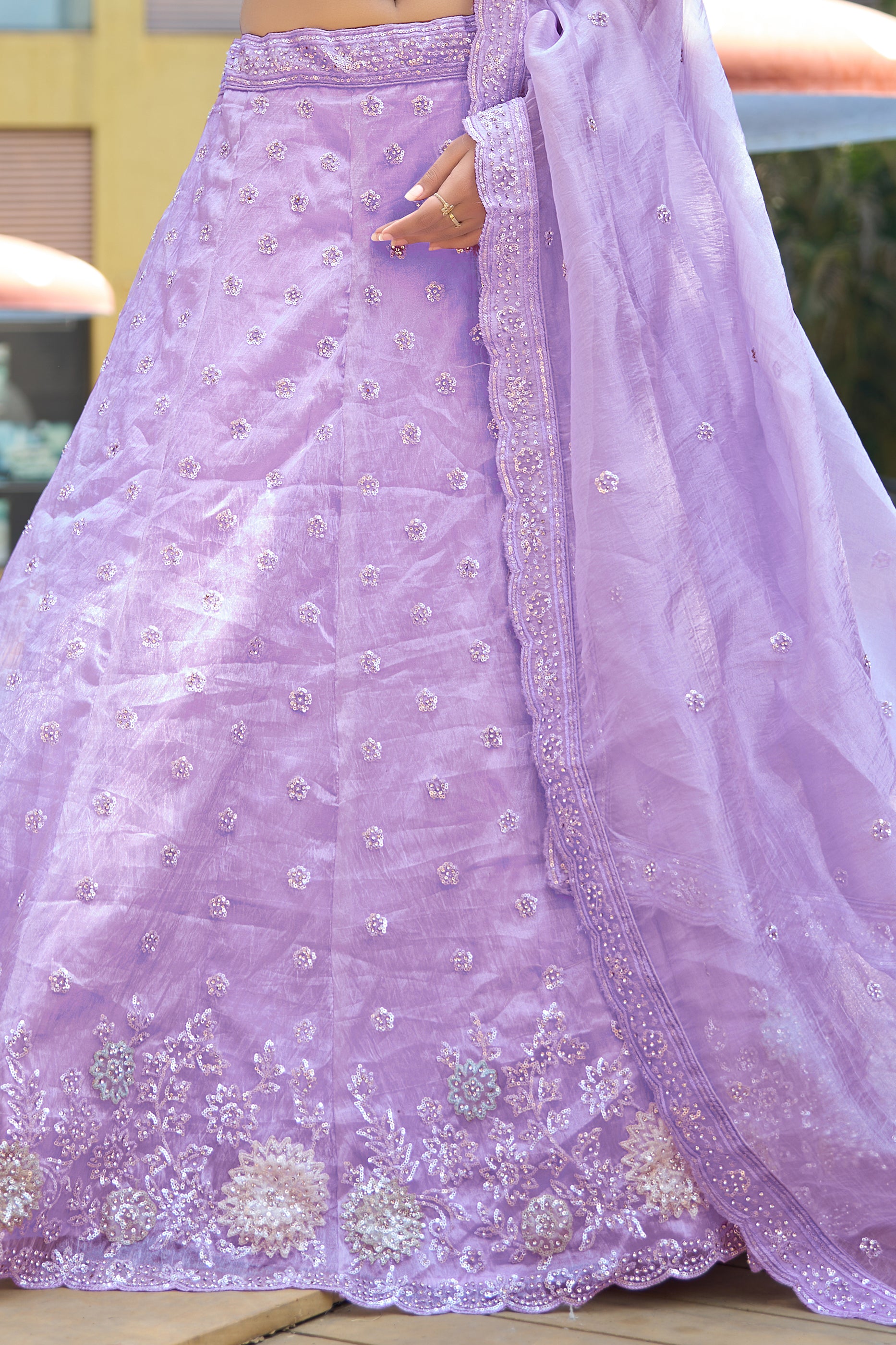 Drape yourself in elegance with this Lavender Semi-Stitched Embroidered Organza Lehenga. Crafted from organza, it features exquisite heavy embroidery and sequin work. The lehenga fits up to size 42, ensuring a perfect look for any special occasion. Accompanying the lehenga is a luxurious 2.25-meter organza dupatta with intricate work. The unstitched blouse piece, also made from organza and measuring 1 meter, allows for personalized tailoring. Ideal for weddings, engagements, and receptions, this ensemble promises to make you shine.