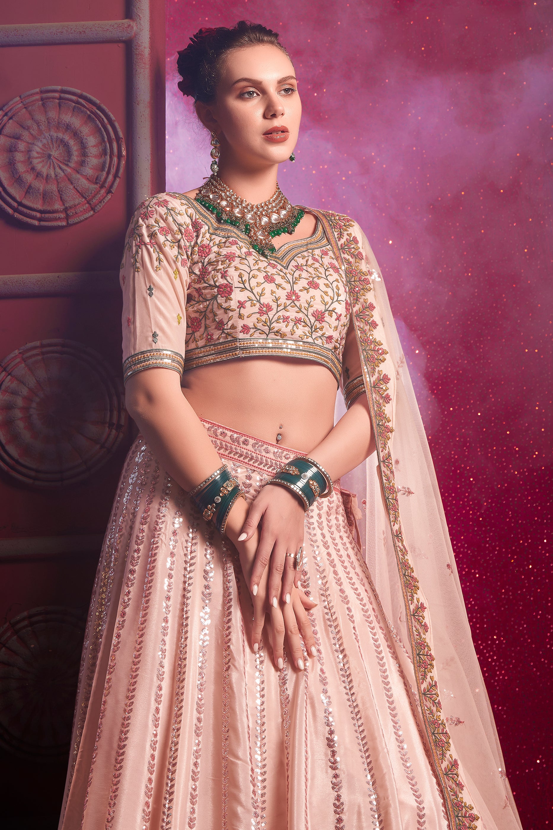 Elevate your elegance with this exquisite Peach Readymade Embroidered Silk Lehenga. Crafted from a luxurious silk blend, the lehenga showcases premium sequin and intricate embroidery thread work. Paired with a premium net dupatta, it offers a regal touch to your ensemble. The included stitched silk blend blouse complements the ensemble beautifully. Ideal for engagements, weddings, receptions, or sangeet ceremonies, this lehenga ensures you make a timeless statement.