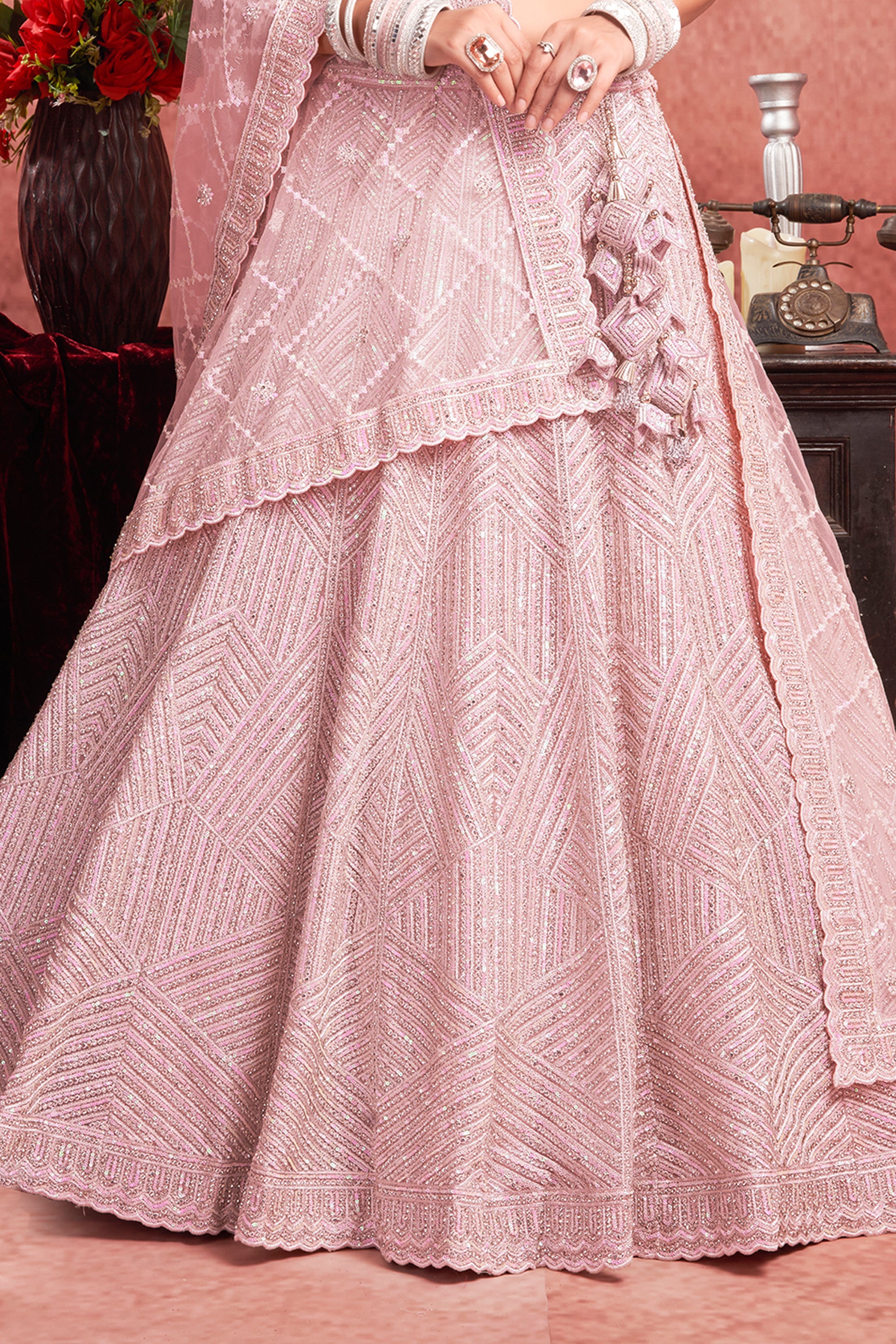 This Powder Pink Readymade Embroidered Net Lehenga exudes elegance. Crafted from premium net, the lehenga features intricate handwork with mirror and stone accents. The 14 kali design offers a generous 5.5-meter flair, ensuring an exquisite drape. The matching dupatta and stitched blouse, also in premium net with detailed handwork, complete the ensemble. With a weight of 5kg, it is perfect for weddings, engagements, or receptions. Experience premium craftsmanship with this stunning lehenga.