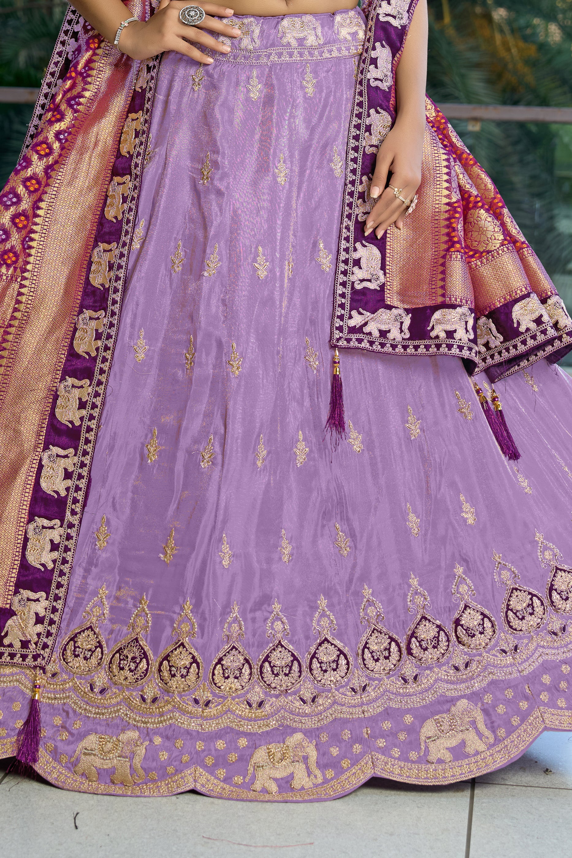 Experience elegance with the Purple Semi-Stitched Embroidered Tissue Jacquard Lehenga. Crafted from luxurious tissue jacquard, this lehenga features exquisite thread embroidery and sequin detailing. The ensemble includes a 2.25-meter tissue viscose dupatta, adding a touch of grace. The blouse, made from matching tissue jacquard, remains unstitched and offers a length of 1 meter for customizable fit. Ideal for weddings, receptions, and special occasions, this lehenga is perfect for those who appreciate intricate design and quality craftsmanship.